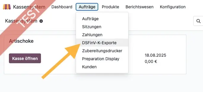 - Für Prüfungen des Finanzamts lädst du TSE/DSFinV-K-Daten direkt aus Odoo herunter.